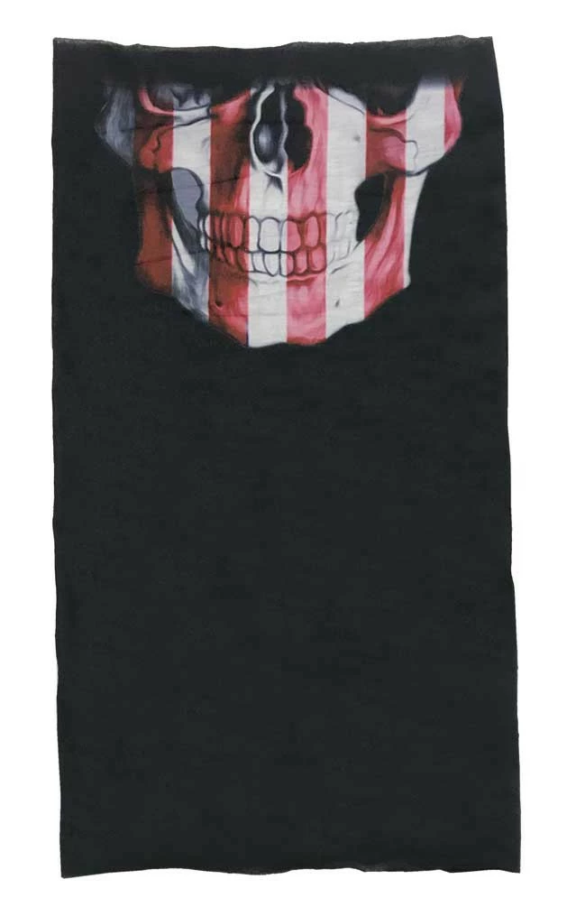 Epoch Eyewear has engineered a versatile 8 way multifunctional headwear gaiter. Super soft, 100% Polyester head wrap or neck gaiter in patriotic flag and skull designs. Versatile product comfortable to wear 12 different ways. Many different ways to wear as a headwrap, neck gaiter for warmth, gaiter as a face mask or pony tail holder. Color: Black/Navy/Gray/Red. EE6544