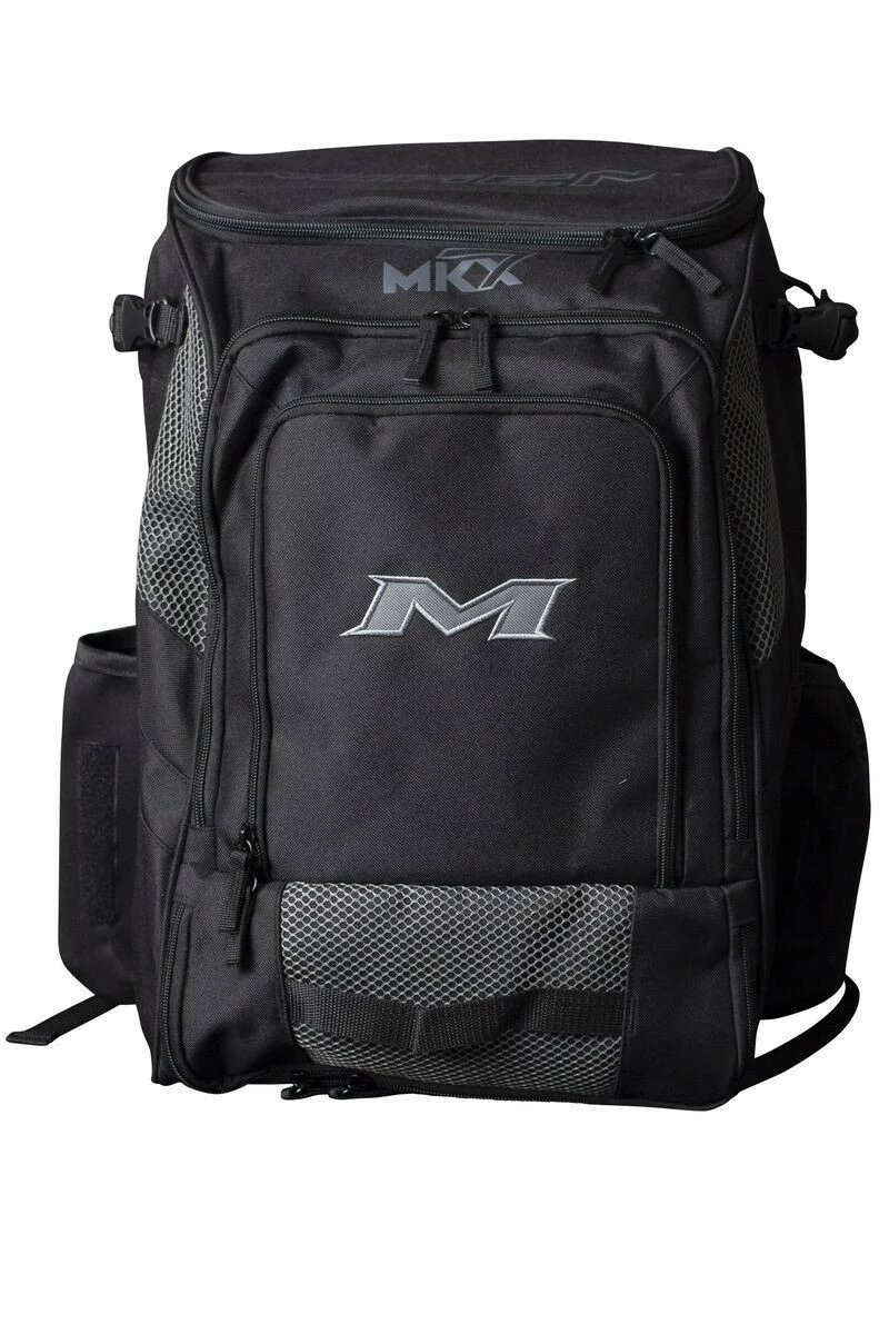 The all new Miken Backpack features 2 elasticized neoprene bat sleeves, a durable “J” style fence hook, top valet tray with lined pocket for phone, front storage pocket, separate shoe pocket on bottom, Velcro strip for exterior batting glove storage, and an easy to clean tarpaulin bottom.
