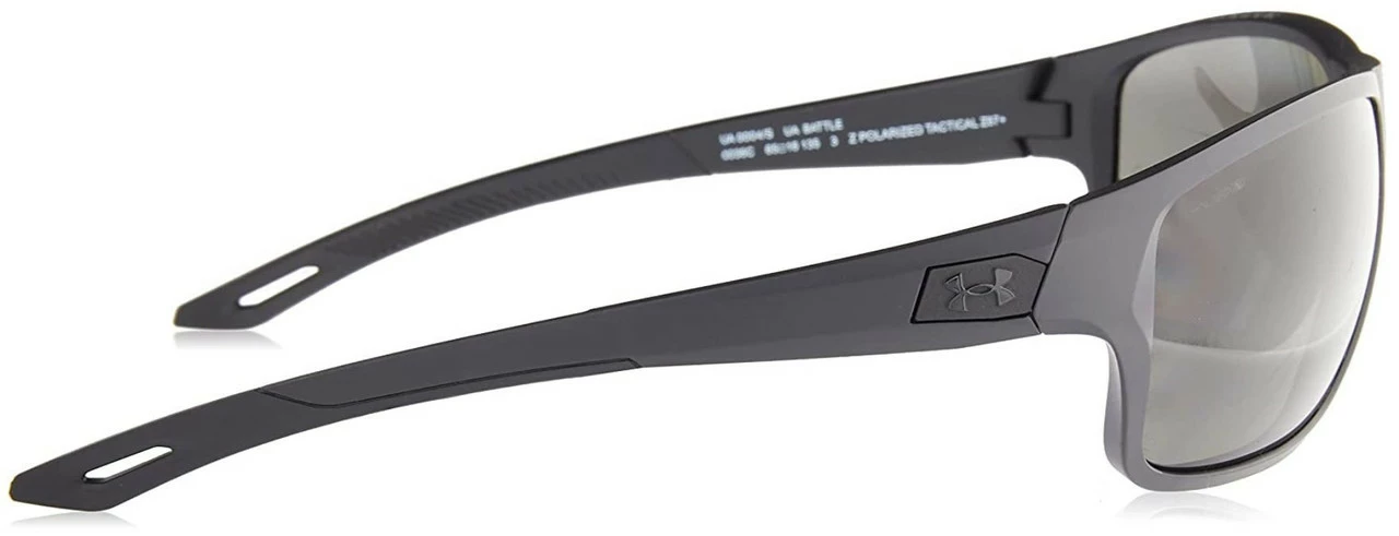 Under Armour Men’s UA Battle Rectangular Polarized Sunglasses With Case � Matte Black/Grey, UA BATTLE-0003. Under Armour took their most most popular tactical glasses and added more coverage in the temple area to block out more light that comes in from the side and could distract you. These polarized sunglasses from Under Armour feature fully-adjustable UA ArmourGrip nose pads have a lasered engraving for ultimate comfort & stability along with injected front & temples with non-slip rubber trim keeps the frames on your head. Auto-lock stop hinge allows the temples to lock securely in place for a sturdy fit while the water smudge resistant coating makes the lenses easier to clean with clearer optics. Meets ANSI Z87.1 industrial standards for high-mass & high-velocity impact protection
