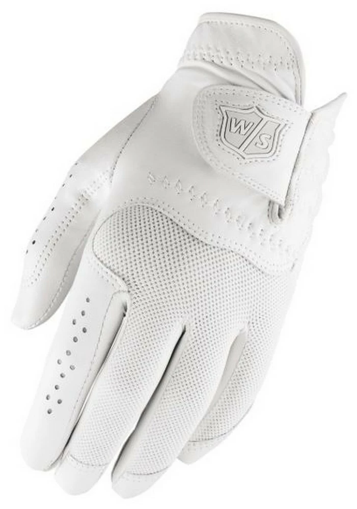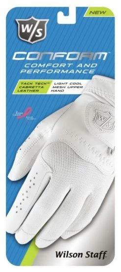 The new Wilson Staff Women’s Conform Glove hasan idealfit and feel. The premium Abyssinian cabretta leather has 3M Scotchguard protection for softness round after round. The Ultramate Velcro gives it a tighter closure and hold throughout play. performance mesh dissipates heat and moisture. This glove looks feminine and appeals to all women golfers. Color: White. WGJA00303